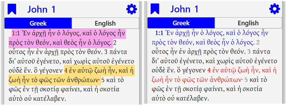 I've attached two images from my app which which show the difference. This is the first paragraph of the Gospel of John from the Greek New Testament. As you can see, the left screen has changed the background color and the right screen has changed the foreground color. (I removed the metadata so the background does not have the vertical lines.) I would prefer the "highlighting" effect on the left by changing the background color. I think it's easier on the eyes and makes the effect more obvious. But I'll "settle" for changing the foreground color if I can't get this solved any time soon. Having all the vertical lines in the highlighted text looks strange. I'm fear that I will get A LOT of emails from users saying "the new highlighting feature looks really weird on my phone!" :-)