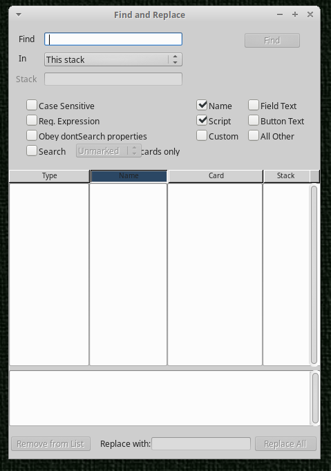 But if your task is to find every occurrence of a string, it does not matter. You need only look at controls, cards and stacks. Those are the only repositories of scripts. I made this when I first changed over from HC to LC. It looks at all scripts in a stack and its substacks. You can modify it to find a string instead of just counting "active" lines and total number of lines in all scripts: