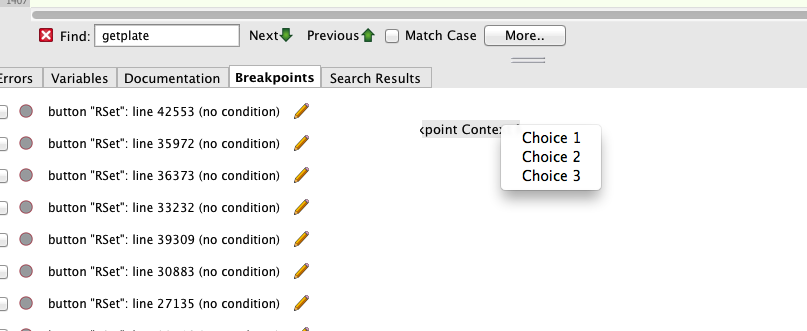 Delete? Fascinating. How? This is in the breakpoint pane of the script editor, where one cannot choose the pointer tool to select a control. Or at least I cannot. The button does its pulldown thing regardless of the state of the tool, which, though hilited in the tool palette, never changes from a pointer to a pointer with the selection indicator to its lower right.