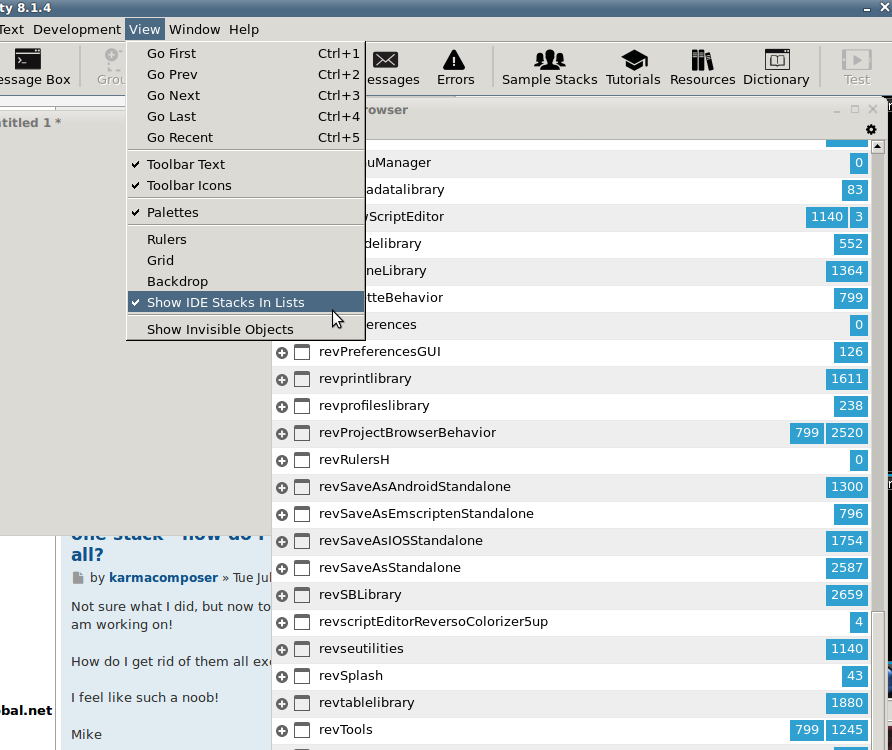 Or whatever the wording is, but LC IDE is written in LC, so the IDE stacks are all accessible, but typically hidden from the lists and menus, so as to leave your view with only your project. They can be set to show up though.