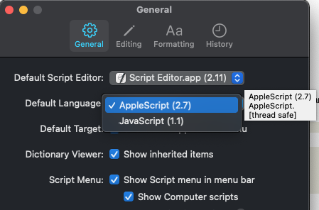 Also, in the General tab, I checked the last two check boxes to set the Script Editor so it appears in Finder's menu bar, at the top right, with the Script symbol and it's own menu.