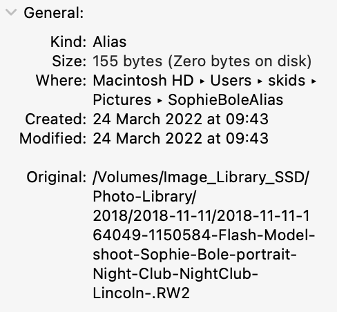 which I guess means it is a different kind of "link". This is back to the start as the Livecode and the Applescript functions have the same issue : when asked the "alias" reports its kind as that of the target so therefore there is no alias. Whats annoying is that MacOS displays the details when a command I is made on the "alias". This is from an alias that points to a target on second mounted volume as can be seen in the "Where" and "Original" fields above. The challenge is discovering how MacOS sees the "Kind" as alias and resolves the path to the target file. Probably worth mentioning that the Livecode commandcom.adobe.raw-image