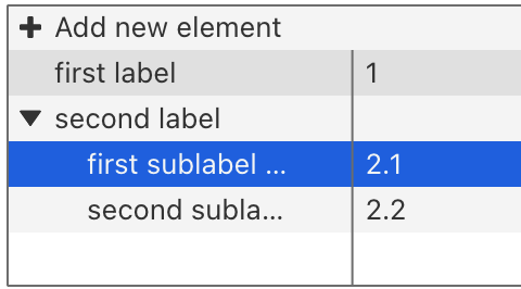 So, the line with 'second label' with data = 2 does not appear. Also, I can get an 'actionDoubleClick' message when I click on the leaves (#1, 2.1 & 2.2) but not on #2