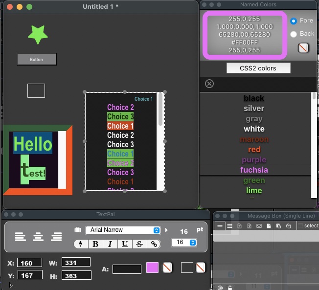 I'm basically working on mostly graphics things right now, trying to turn the IDE into a more QuarkXpress (v3 the best version)-like setup by building a text / tools palette loosly modeled on Quark (v3's) measurements palette, and changed command-keys to be more standard page-layout key commands... command+shift+C = center the selectedChunk, instead of Edit Card Script, Command-shift+ +/- to scale text up/down, etc.