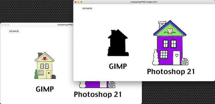 In a standalone the PNG processed in GIMP fails, while the PNG prcessed in Photoshop 21 trial version succeeds.