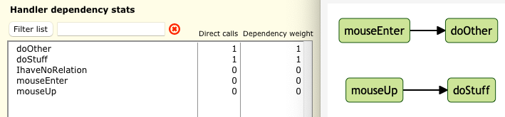 - Enhancement: Possibility to filter out and filter in certain handlers. Filtering out some handlers, such as ”log” or mouse events can make some flowcharts less crowded