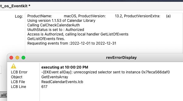 The error message that Richmond posted is exactly the same line of code that failed last time meaning that my simple protective fix has not worked. I now suspect that Apple have removed a property and failed to update the documentation or they have introduced a bug into the Eventkit on Ventura. After all they report having made significant changes in that area.