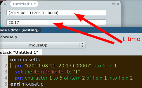 put character 1 to 5 of item 2 of t_time into field 1