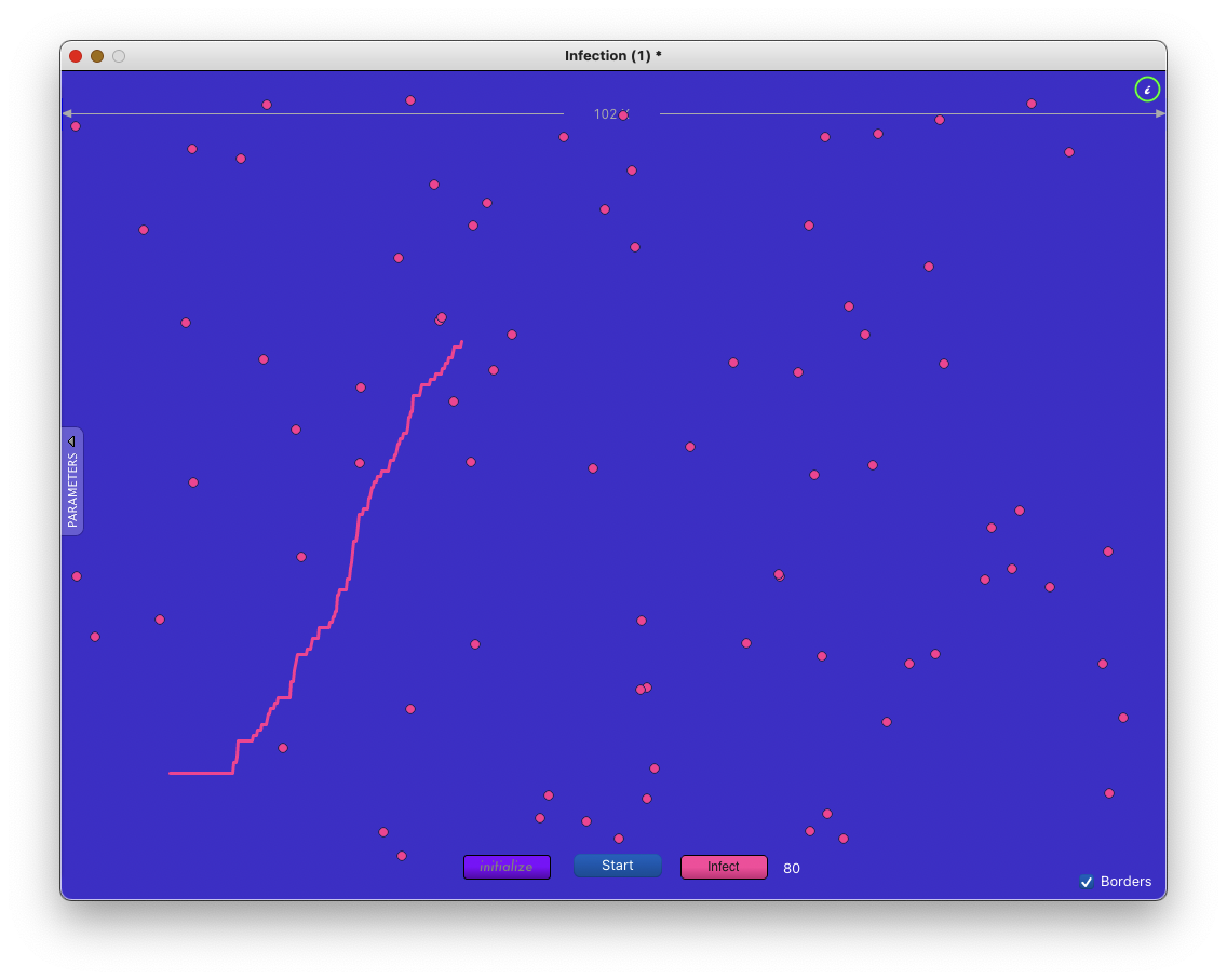 It would be very interesting to see what happens happens if individuals are able to transmit infection for only a certain amount of time. Also in that case setting a period of 'immunity' whereby individuals infected and resolved will be immune for a period of time, perhaps semi-randomly (actually simulating real life in other words, assuming non-lethal infection).