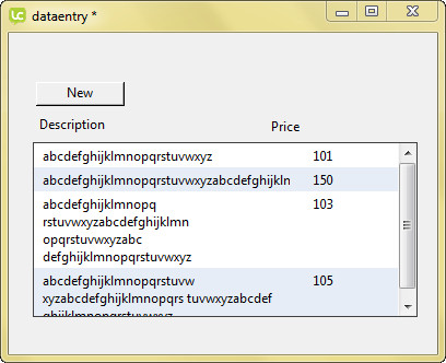 I've knocked together a simple file here. If you press on the New button, you should see an input screen with two fields, description and price. Enter values in both fields, but if you type in a long word in the description box (i.e. abcdefghijklmnopqrstuvwxyzabcdefghijklmnopqrstuvwxyzabcdefghijklmnopqrstuvwxyz) without a space, I would expect the word to wrap around in the description box but it seems to continue scrolling to the right. Whats more important is on save, the value is dispatched to the datagrid and the value seems to overlap the price field, when I would prefer it if the field in the data grid displayed as much as the field defined by the width.