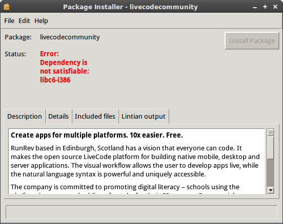 I added in deb package all dependencies needed to work without problem. Since Linux Livecode is i386 compiled, I put in the package libc6-i386.