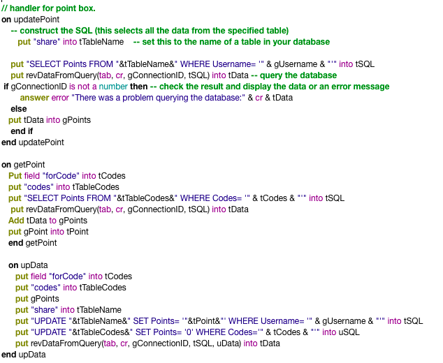put "SELECT Points FROM "&tTableCodes&" WHERE Codes= '" & tCodes & "'" into tSQL
