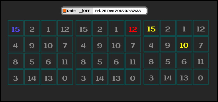 I used only one magic square (the one used by Duerer (add 1 to each cell)) to allow faster reading. You have to add the coloured numbers of each. You may concentrate on the 'sum-anchors' 0,15,29,42 and 54 when reading the display.