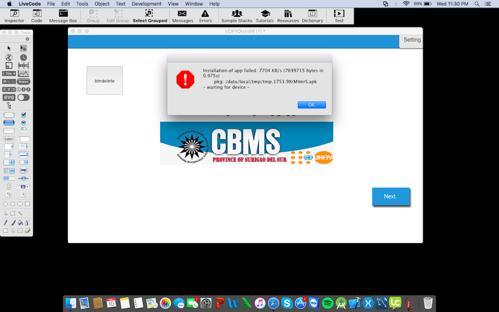 I did not get a specific error as you did, the IDE hung instead and required a force quit because there is no way to exit the build dialog. But the symptom was the same, it failed after the build was complete and while trying to transfer the app to the phone or tablet.