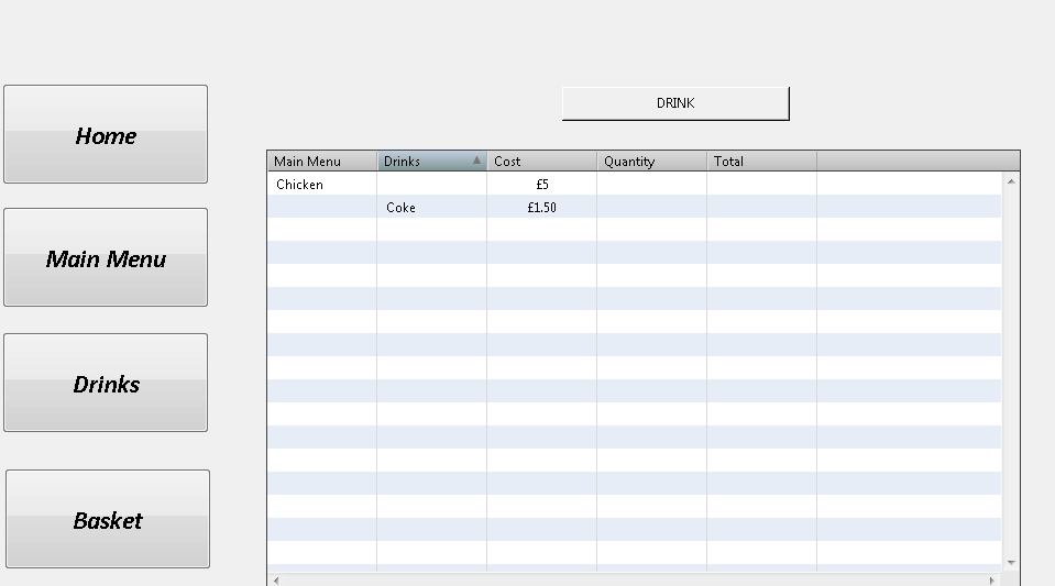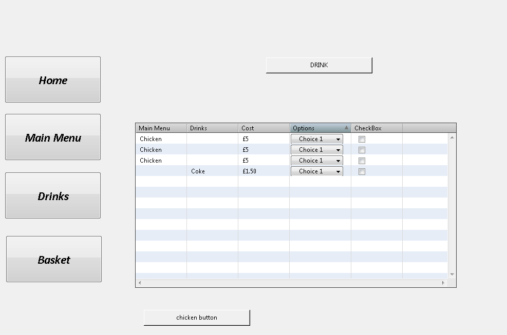 when i click the drink button it deletes everything in the first row for the chicken button