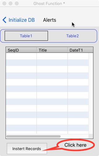 you are right, but it is created when I click on the "Insert Records" button. By the way I can see the records were in fact added by checking the variable "tData" contents on the retrieveData function. The problem is that I can get tData to be displayed on the DataGrid......the file "ghost.sqlite"" does of course not ecxist..