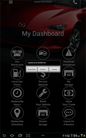answer "Leave a review on:" with "DealerRater" or "Google+" or "Yelp" or "Cancel"