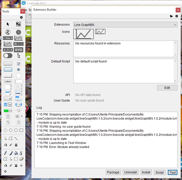 to have again Line GraphBN into the tool palette I've tried the Extention Manager from the Tools menu selecting the .ice file situated into the folder "com.livecode.widget.lineGraphBN.1.0.2"