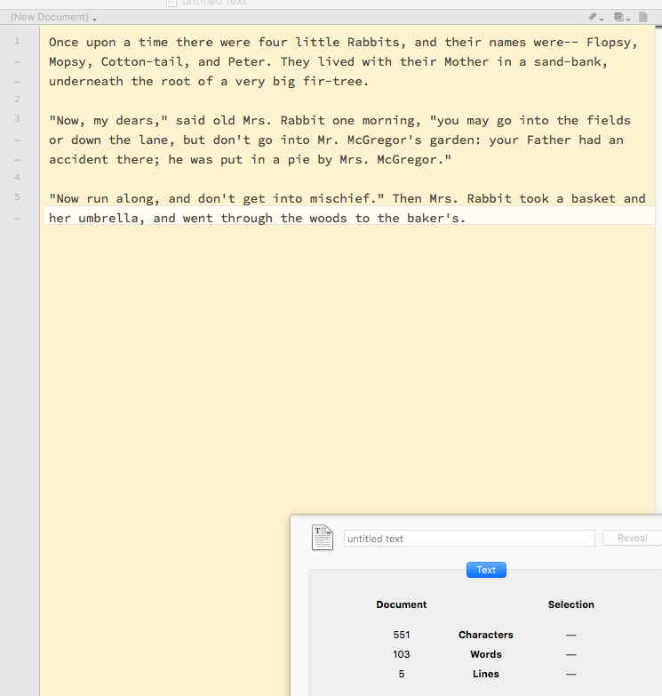 ... (from sample text below) put "Once" in field "TheText", replace "Once" with the word "upon", replace the word "upon" with the word "a", etc. The delay between replacing the words is in milliseconds probably averaging 200-300 milliseconds. The short/simple explanation is to say that the words are shown/replaced in a repeat loop using the total number of words as the max number in the repeat loop. If the number of words count is off then the repeat loop will end up not showing all of the text. While for this sample of 100 words, depending on which method you use to count words, it's off from 1 to half a dozen words. While that might not seem like much, some of the text files might be over 70,000 words which means the word count could be off in the hundreds for such a text file.