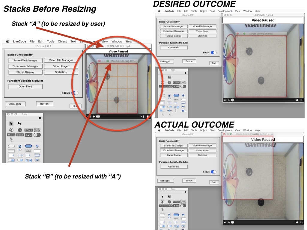 Jean-Marc, thank you for the suggestion. This would always center stack B over A, but the stacks will not always be positioned as on the screenshots -- e.g., B could be somewhere close to a corner of A etc. I thought that I might need to know the locations for both stacks prior to the resizeStack message being sent. Then I might be able to calculate the relative loc changes with this information and update accordingly. Probably the best way to do this would add a custom property to the stacks that stores the loc, such that this custom property is modified/updated each time the stack position changes, and when the stack is opens and closes. I have not tried that one out yet.