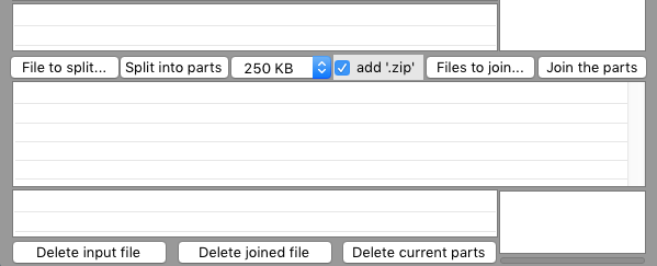 Made especially for use with zip files for/of the LC forums (you can upload up to three files of size <= 250 KB). The upload (of parts) to the forums needs endings ".zip" (use check button). The downloader can then use this stack to join such parts again [tested with files of type .lce, .dmg, .zip, .tar and up to 2 GB length].