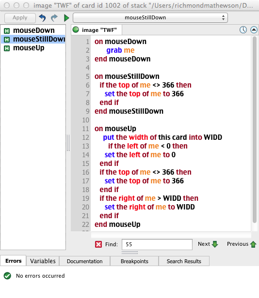 (I do dearly wish it was as simple as SuperCard's grab [with message] [within rect]. I can see how this more complex mouseDown/mouseUp/mouseRelease/mouseMove setup can be really powerful, but surely there's room for something simpler (and in that sense more elegant) in the language as well?)