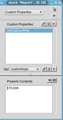 Stack "Report" is a substack of my main stack, so if I understand how stacks work correctly, I should be able to write the custom prop. there and it will persist through closing and opening the program. In the IDE this does indeed happen, and it lists the x / y coordinates of the program.