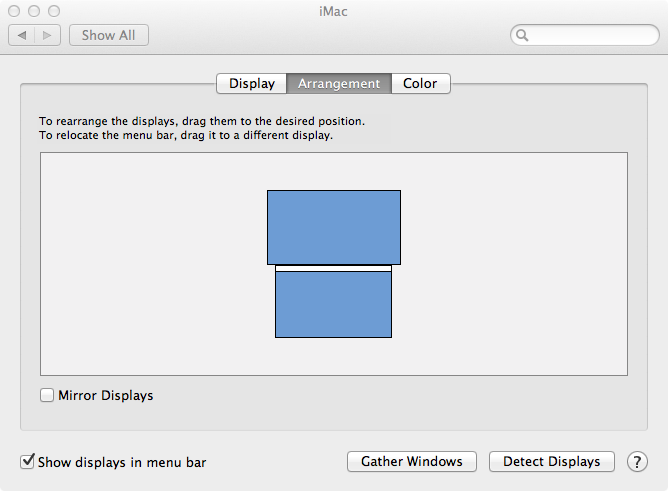 I mentioned that the answer command, for instance, would not work with the new monitor connected. If, however, I invoke that command (nothing happens), and then change either monitor's resolution, arrangement, rotation, anything at all having to do with the configuration of two monitors in the displays pane of the system settings, the screens both go black (as they are wont to do when making those sorts of changes), and the dialog pops up on the iMac.