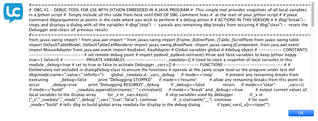 #  DBG V1 - DEBUG TOOL FOR USE WITH JYTHON EMBEDDED IN A JAVA PROGRAM
