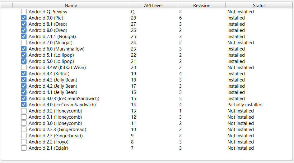 Almost have all the APIs in Android Studio installed.