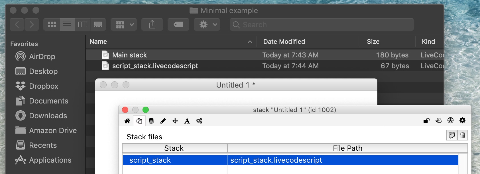 Attaching minimal example stacks. I have set Main stack to have behaviour of script_stack.livecodescript. In the stack script of the latter I have:
