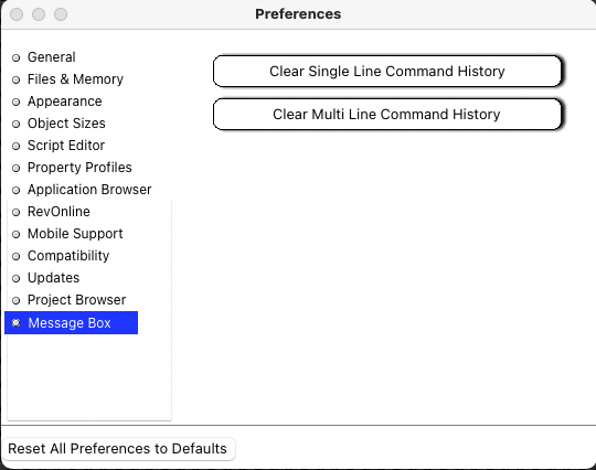 set the IDEMultipleLinesMessageHistory of stack "revPreferences" to empty