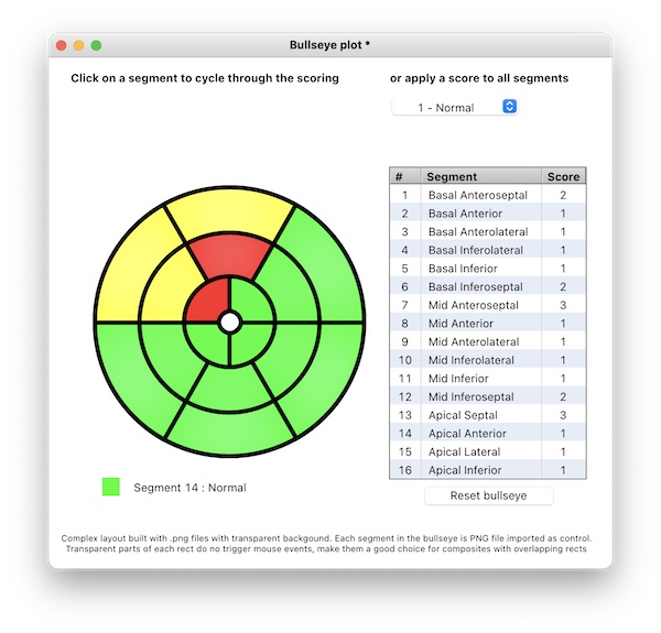 For now, here's my effort using .png files, extracted from my project for simplicity. The segments can be clicked on to cycle through scores/colours, or can be changed globally... nothing too complex. But i guess the challenge would be to replicate this using native LC tools only!