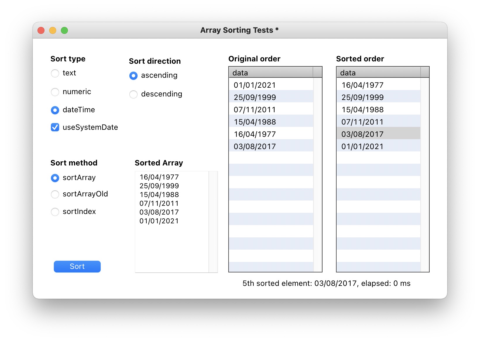 But while this approach works just fine for numeric and text sort types, it fails for dateTime type because the sorting of lines in a list (not the array) fails.