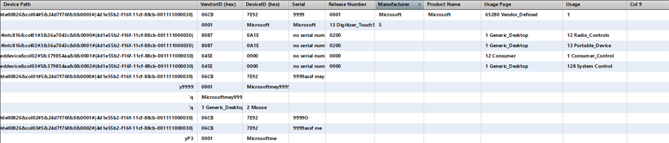 Each time I click it, the list refreshes, but there are definitely some data glitches - the serial number will append some random text snipped from elsewhere (such as "9999riptlibrary" or "9999assp" and the Manufacturer frequently has some "non 7bit ASCII" characters appended, such as "Microsoftmey`s" or "Microsoftmec{`A" and frequently the datagrid is populated with columns offset and gaps. I'm not sure what it's parsing but it's certainly impressive, but not working quite properly cross-platform yet.