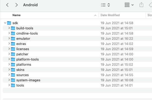 All files have been installed already but nothing is showing in that location except "sdk" folder. In the Android Studio, it shows SDK location as: /Users/myName/Library/Android/sdk