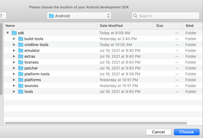 /Users/myName/Library/Android/sdk). Now you should see a list of files in the file dialog where one of the folders is "sdk". Click "sdk" then the button marked "choose".