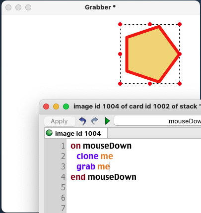 on mouseDown if "card" is not in the target then clone the target set the loc of last control to the mouseLoc end if end mouseDown on mouseMove if "card" is not in the target and the mouse is down then set the loc of last control to the mouseLoc end mouseMove