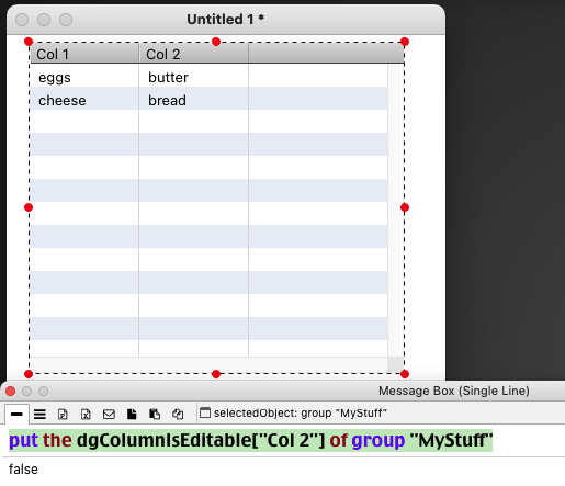 set the dgColumnIsEditable["Col 2"] of group "dg1" to FALSE