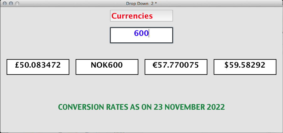 Thanks, but I was expecting more like a drop down menu where I can choose the currency and choose also which one to convert torichmond62 wrote: ↑Wed Nov 23, 2022 9:12 amJust the same as you would make a temperature converter . . .