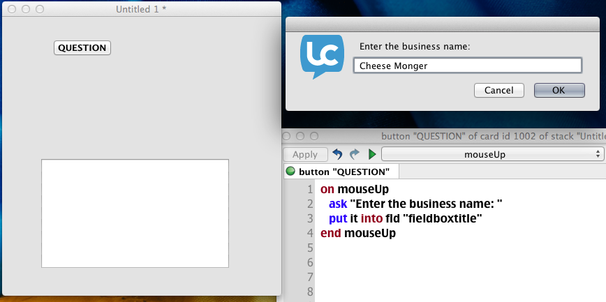 ask question "Enter the business name." titled field "fieldboxtitle" of cd "template1"