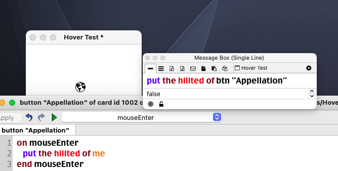 This worked fine in the example stack I uploaded; but after resetting the autoArm property of all my buttons they still won't display the hoverIcon on mouseEnter. Is it possible that there is something else about my stack's HyperCard heritage that is blocking this? I just looked at the lists of stack & button properties, but nothing jumps out as the possible culprit.