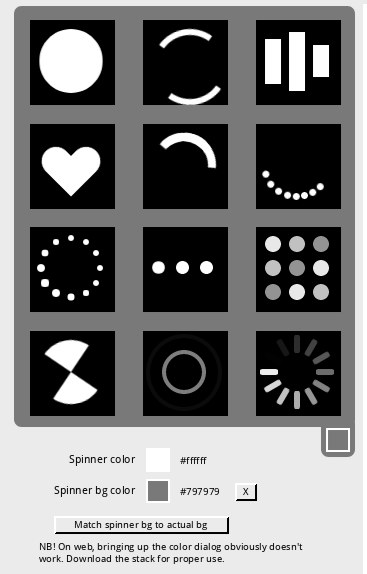 Version 2.0 has a new set of 12 modern spinners. They also include a script that enables you to easily change the color of the spinner, and the background of the widget, on the fly, even after copying it to your own stack.