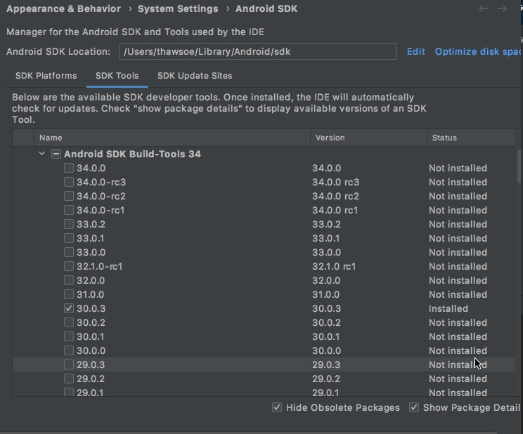 What version of Android Build Tools are installed? You need 30.0.3.
