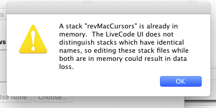 One other question, I'm encountering a new error while compiling this HTML5 regarding "revMacCursors". It seems a stack of this name is "already in memory" [see attached] but 1) I don't know how this is generated and 2) the error pops up twice during the compile process and gives no option except "OK" which is alarming as I wonder if I'm damaging something I need in my LC engine. Anyway, it's a mystery and I'd like to understand how it gets there. It appears even when I "put empty into stacksInUse" before compiling [only 1 of my own stacks is "in use" downstream.