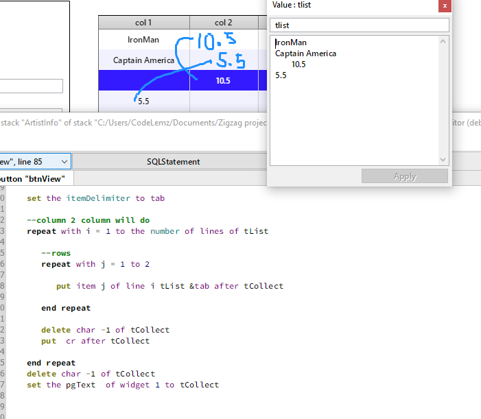 in order for my code to make sense, please see this explanation first. I have been collecting tips and tricks for LiveCode either by arriving at solutions myself or copying other's. I regret I have no recollection where I borrowed this from and slightly edited (if you are the author please let me know), but it explains how to retrieve SQL data both ways (with a simple TSV variable or a database cursor). I plan to create a subreddit to post these all at some point and open it to others to post clear solutions/algorithms, but for now these reside on my own machine.