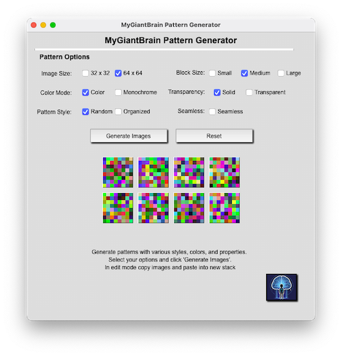 The attached Pattern Generator allows you to create 32 x 32 and 64 x 64 pixel images with different pattern styles and includes an option to create images with transparency. I have embedded core handlers from the Minimum Drawing Library (see Games) so this does not require the library to operate. I am releasing it as open source under the MIT license