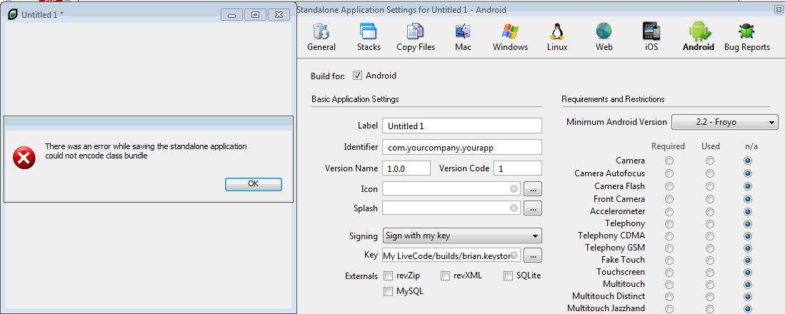 Emulator is up and running fine. Now having same issue as That1Guy with getting LC to work with the Android Emulator or building Standalone Application on Windows 7. I keep getting the error 'Could not encode Class Bundle'.