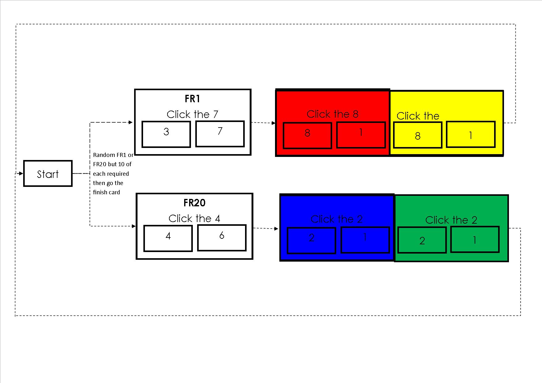 Am having a little trouble Have got the code on the card and the other bit of code on the start button also have placed the code on the coloured buttons as the user is always directed from the ‘FR1 white’ to ‘Yellow or red ’ or ‘FR20 white’ to ‘blue or green’. Have attached a picture that I hope will make a bit more sense?