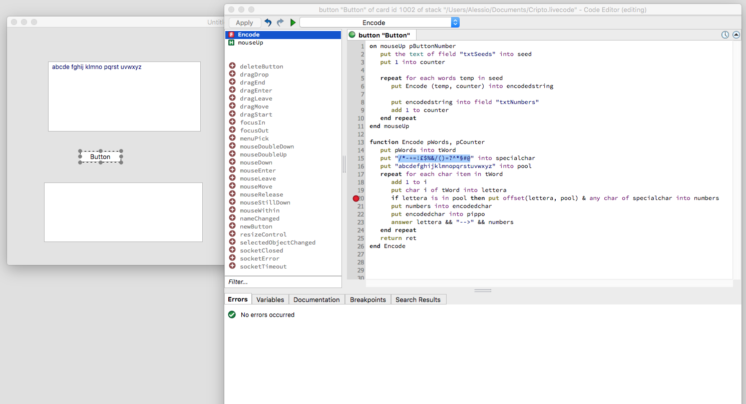 on mouseUp pButtonNumber put the text of field "txtSeeds" into seed put 1 into counter repeat for each words temp in seed put Encode (temp, counter) into encodedstring put encodedstring into field "txtNumbers" add 1 to counter end repeat end mouseUp function Encode pWords, pCounter put pWords into tWord put "/*-+=!£$%&/()=?^*§#@" into specialchar put "abcdefghijklmnopqrstuvwxyz" into pool repeat for each char item in tWord add 1 to i put char i of tWord into lettera if lettera is in pool then put offset(lettera, pool) & any char of specialchar into numbers put numbers into encodedchar put encodedchar into pippo answer lettera && "-->" && numbers end repeat return ret end Encode